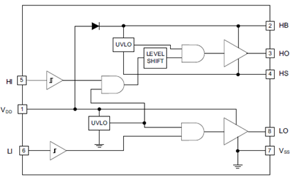 An on-chip bootstrap diode eliminates the external discrete diodes. Under-voltage lockout is provided for both the high-side and the low-side drivers forcing the outputs low if the drive voltage is below the specified threshold.