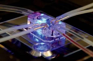 Wyss研究所采用制作計(jì)算機(jī)芯片的技術(shù),將活的人體器官細(xì)胞植入到芯片中,同時(shí)芯片可以模擬細(xì)胞在人體內(nèi)的環(huán)境。一個(gè)器官芯片的體積與一個(gè)閃盤相當(dāng),由柔性的半透明聚合物制成。在芯片的槽道中有三個(gè)并列的流體通道,兩邊的通道是真空通道,中間的通道是植入細(xì)胞的通道。直徑小于一毫米的通道與從人體器官上提取的細(xì)胞相連,可以在芯片內(nèi)復(fù)雜的管道中流動。當(dāng)營養(yǎng)物質(zhì)、血液、需要測試的化合物,如實(shí)驗(yàn)性藥物從微流管中泵入時(shí),這些器官的細(xì)胞能復(fù)制一些活體器官的關(guān)鍵功能。