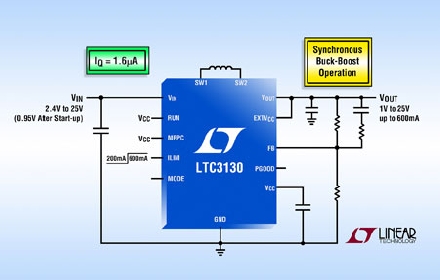 Linear推出同步電流模式降壓-升壓型轉(zhuǎn)換器 LTC3130 和 LTC3130-1,這些器件可從多種輸入源提供高達(dá) 600mA 連續(xù)輸出電流,輸入源包括單節(jié)或多節(jié)電池以及太陽能電池板和超級(jí)電容器。其 2.4V 至 25V 輸入電壓范圍和 1V 至 25V 輸出范圍 (LTC3130 是可調(diào)的) 在輸入高于、低于或等于輸出時(shí),可提供穩(wěn)定輸出。用戶可選突發(fā)模式 (Burst Mode®) 工作使靜態(tài)電流降至僅為 1.6µA (無負(fù)載時(shí)為 1.2µA),從而提高了輕負(fù)載時(shí)的效率,并延長(zhǎng)了電池運(yùn)行時(shí)間。LTC3130/-1 采用的專有降壓-升壓型拓?fù)湓谒泄ぷ髂J较露伎商峁┑驮肼暋o抖動(dòng)切換,非常適合那些對(duì)電源噪聲敏感的 RF 及精確模擬應(yīng)用。該器件還包括可編程最大功率點(diǎn)控制 (MPPC) 功能,從而確保從光伏電池等非理想型電源提供最大功率。LTC3130-1 具備 LTC3130 所提供的全部功能,還可提供 4 個(gè)用戶可選固定輸出電壓,分別為 1.8V、3.3V、5V 和 12V,從而無需可調(diào)輸出版本所需的電阻分壓器。