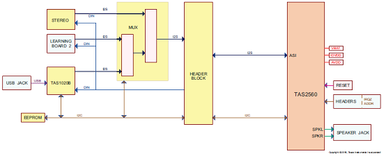 The TAS2560 EVM supports evaluation and development with the TAS2560 through the followinginterfaces: