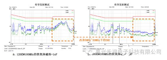 圖2中,較高的鐵氧體磁珠阻抗可以實現(xiàn)較低邊沿速率的D類輸出;使用600ohm@100MHz 的鐵氧體磁珠,可以獲得最低邊緣速率的D類輸出,最終在高頻段實現(xiàn)最佳EMI結(jié)果。然而,對于相同型號相同封裝的磁珠,阻抗較高意味著額定電流較小,所以還要考量其額定電流是否符合電路要求。圖3為鐵氧體磁珠對于傳導(dǎo)性EMI的效果。