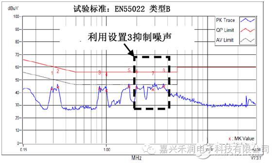 不過又出現(xiàn)了另外一個問題,圖9顯示振蕩加劇了2MHz~4MHz的頻帶噪聲(如果D類輸出電流增加的話,振蕩會更加嚴(yán)重)。從理論上講,諧波分量越高,振幅應(yīng)該越小,但是,濾波器的諧振頻率點改變了這一情況。我們看一下圖8.a,與設(shè)置4相比,設(shè)置3在2MHz~5MHz頻帶具有更好的噪聲抑制能力。最終,設(shè)置3在減少振蕩方面表現(xiàn)出最佳的調(diào)優(yōu)效果,并且獲得了較低的邊緣速率,及良好的2MHz~5MHz的EMI裕量。