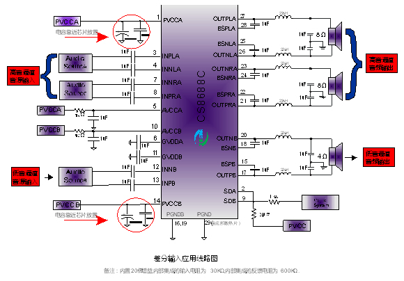 CS8688C內(nèi)置了過(guò)流保護(hù),短路保護(hù)和過(guò)熱保護(hù),有效的保護(hù)芯片在異常的工作條件下不被損壞。在供電電源小于16.0V的情況下,CS8688C可以驅(qū)動(dòng)一個(gè)4Ω 的低音喇叭和2個(gè)8Ω高音喇叭,整體音頻子系統(tǒng)具有高達(dá)90%的效率,使得在播放音樂(lè)的時(shí)候不需要額外的散熱器。