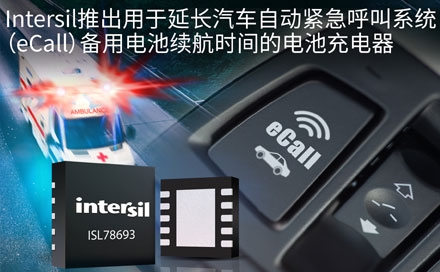 Intersil公司(納斯達(dá)克交易代碼:ISIL)今天宣布,推出可延長(zhǎng)汽車自動(dòng)緊急呼叫(eCall)系統(tǒng)中使用的磷酸鐵鋰(LiFePO4)電池續(xù)航時(shí)間的3.6V單芯電池充電器---ISL78693。ISL78693電池充電器的漏電流是競(jìng)爭(zhēng)產(chǎn)品的四分之一(3uA),可延長(zhǎng)eCall系統(tǒng)備用電池的供電時(shí)間。Intersil將于2017年1月18-20日在日本東京國(guó)際汽車技術(shù)展(Automotive World)E30-11號(hào)展位展示ISL78693。