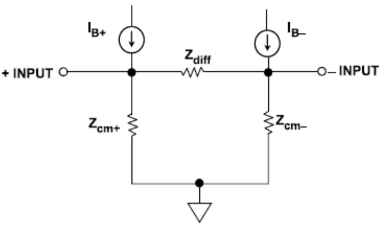 理想情況下,并無電流進入運算放大器的輸入端。而實際操作中,始終存在兩個輸入偏置電流,即IB+和IB-。