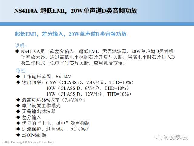 | NS4110A ESOP-8小封裝20W單聲道D類功放IC產(chǎn)品簡(jiǎn)介 |