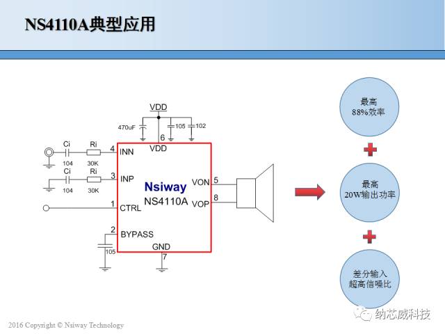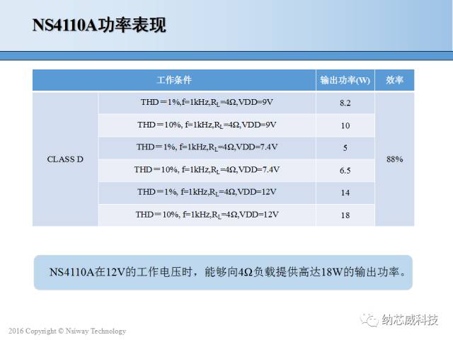 | 納芯威科技全新推出20W單聲道D類音頻功放NS4110A。NS4110A是一款差分輸入,超低EMI,無(wú)需濾波器,20W單聲道D類音頻功率放大器。通過(guò)高低電平控制芯片開(kāi)啟與關(guān)斷,當(dāng)高電平時(shí)芯片進(jìn)入D類工作模式,低電平時(shí)芯片關(guān)斷,應(yīng)用靈活方便。NS4110A 采用先進(jìn)的技術(shù),在全帶寬范圍內(nèi)極大地降低了 EMI 干擾,最大限度地減少了對(duì)其他外部元件的影響。其輸出無(wú)需濾波器的 PWM 調(diào)制結(jié)構(gòu)減少了外部元件、PCB面積和系統(tǒng)成本。NS4110A在12V的工作電壓時(shí),能夠向4Ω負(fù)載提供高達(dá)18W的輸出功率,88%以上的效率更加適合便攜式音頻系統(tǒng)。