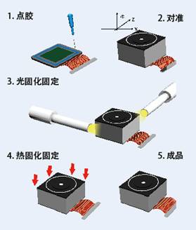 2 、 Dymax 戴馬斯的新技術: 低溫熱固化技術,主要應用于攝像頭組裝的主動對焦制程 (Active Alignment) 膠粘劑中。攝像頭的鏡座與電路板組裝過程中引進主動對焦制程可有效解決產品良率的問題。用于確定鏡頭和濾光鏡片之間的最佳位置,使鏡頭在整個圖像平面將產生最佳聚焦的質量。在使用光固化零部件之前,先對鏡頭進行三維調整,測量最佳位置,再通過光照和加熱完成最終的固化。