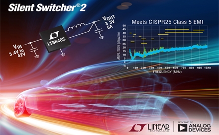 不久前收購了凌力爾特公司 (Linear Technology Corporation) 的亞德諾半導(dǎo)體 (Analog Devices, Inc.,簡稱ADI) 宣布推出 6A、42V 輸入同步降壓型開關(guān)穩(wěn)壓器LT8640S。其獨(dú)特的 Silent Switcher® 2 架構(gòu)采用兩個(gè)內(nèi)部輸入電容器以及內(nèi)部 BST 和 INTVCC電容器,以最大限度減小熱環(huán)路面積。結(jié)合非常良好受控的開關(guān)邊沿和一種具有整體接地平面的內(nèi)部構(gòu)造,并采用銅柱代替了接合線,LT8640S 的設(shè)計(jì)大幅度地降低了 EMI / EMC 輻射。這種改善的 EMI / EMC 性能不容易受到電路板布局的影響,從而簡化了設(shè)計(jì)和降低了風(fēng)險(xiǎn),即使在使用兩層 PC 板時(shí)也不例外。LT8640S 在其整個(gè)負(fù)載范圍內(nèi)采用一個(gè) 2MHz 開關(guān)頻率,能夠輕松地滿足汽車 CISPR25 Class 5 峰值 EMI 限制要求。另外,還可使用擴(kuò)展頻譜頻率調(diào)制以進(jìn)一步降低 EMI / EMC 輻射水平。