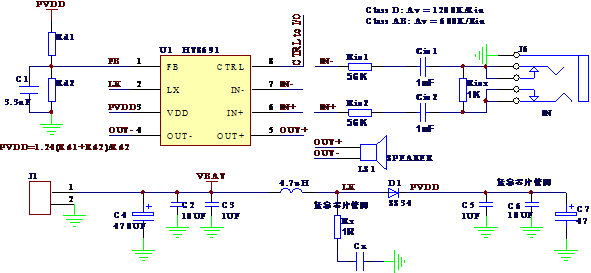 PVDD端直接提供功放的電壓和電流,因此也需要一定的濾波電容。推薦至少使用1uF貼片電容并聯(lián)220uF電解電容的組合,如果條件允許,則使用470uF//10uF//1uF,并靠近芯片引腳放置。