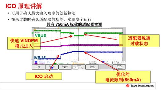 下圖可以清楚的了解到ICO的工作原理:綠線為TI的VBus,接入電池后開始充電,此時(shí)ICO模式作為較小的電流監(jiān)測。當(dāng)電流逐漸上調(diào)后,VBus電壓下掉,同時(shí)保持在此模式下。這時(shí),VEDPM模式啟動(dòng),但此時(shí)的適配器事實(shí)上已經(jīng)過載,由于VEDPM功能的保護(hù),適配器在發(fā)燙的情況下仍在工作。通過ICO的監(jiān)測和優(yōu)化后,適配器脫離過載狀態(tài),可實(shí)現(xiàn)安全運(yùn)行。