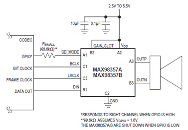 The MAX98357A/MAX98357B are digital pulse-code modulation (PCM) input Class D power amplifiers that provide Class AB audio performance with Class D efficiency. These ICs offer five selectable gain settings (3dB, 6dB, 9dB, 12dB, and 15dB) in I2S/left-justified mode set by a single gain select input and a fixed 12dB gain in TDM mode.