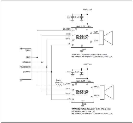 圖6.MAX98357A/MAX98357B采用兩個IC的立體聲PCM工作電路