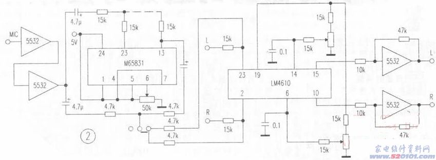 3.卡拉0K電路中,一是M65831的④-⑦腳為延時(shí)時(shí)間選擇控制。為簡(jiǎn)化操作,僅用一只50k電位器一端接電源,一端接地,活動(dòng)臂接⑥腳,其余腳均接電源,這樣旋轉(zhuǎn)電位器即可獲得125us和250us兩擋延時(shí),以滿足歌唱要求。二是卡拉OK信號(hào)不是接入線路放大器,而是分成兩路,各串接一只10k左右的電阻,直接接入LM4610的輸入端,利用LM4610優(yōu)異的性能對(duì)歌聲進(jìn)行均衡,其效果令人驚奇。歌聲格外渾厚明亮,特別是高頻段、齒音、換氣聲絲絲可聞,極具專業(yè)味道。在LM4610的輸入端串接一只15k~20k左右的電阻,調(diào)整其阻值,可使歌聲與伴奏聲比例適當(dāng),同時(shí)還可免用通道信號(hào)選擇開關(guān)。開啟VCD,TV、TA信號(hào)自動(dòng)消除,關(guān)閉VCD其他信號(hào)自動(dòng)恢復(fù)。