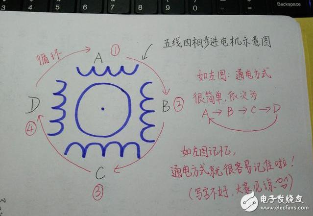 五線四相步進(jìn)電機(jī):在雙拍工作方式下,線圈的通電方式依次是:AB、BC、CD、DA;