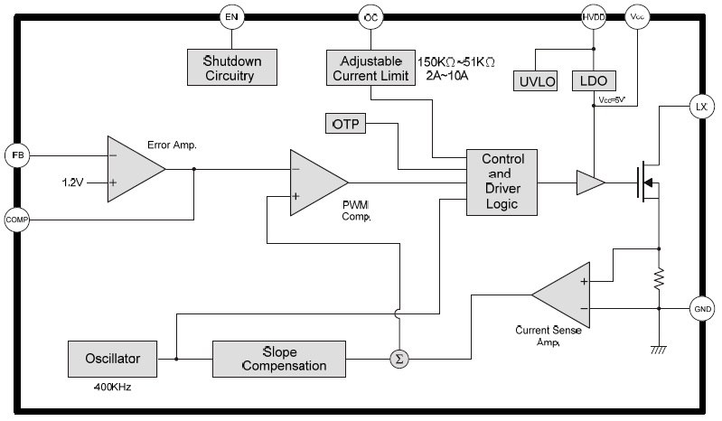 檢測(cè)通過(guò)LX 與GND 之間MOS 電流,也就是電感峰值電流,觸發(fā)過(guò)電流會(huì)將佔(zhàn)空比縮小,限制電感電流,輸出電壓也會(huì)降低;當(dāng)佔(zhàn)空比50%以上觸發(fā)OCP,為了讓PWM 穩(wěn)定方波,IC內(nèi)部做斜率補(bǔ)償,佔(zhàn)空比越大OCP 會(huì)降低,透過(guò)外部電阻R3 調(diào)整OCP,R3 選用參考以下圖表,電阻值150kΩ~51kΩ,OCP 2A~10A,OC Pin 不能空接。