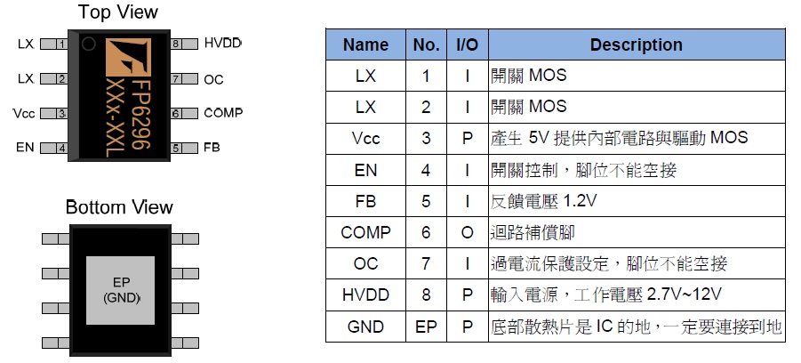 FP6296是一顆電流控制模式升壓轉(zhuǎn)換器,脈波寬度調(diào)變(PWM),內(nèi)置15mΩ/10A/14VMOSFET,能做大功率高轉(zhuǎn)換效率,周邊元件少節(jié)省空間,適合用在行動(dòng)裝置,寬工作電壓2.7V~12V,單節(jié)與雙節(jié)鋰電池都能使用,精準(zhǔn)反饋電壓1.2V(±2%),過(guò)電流保護(hù)透過(guò)外部電阻調(diào)整,電流控制模式讓暫態(tài)響應(yīng)與系統(tǒng)穩(wěn)定性佳,輕載進(jìn)入省電模式(Skip Mode),達(dá)到輕載高效率,封裝為SOP-8L(EP)。