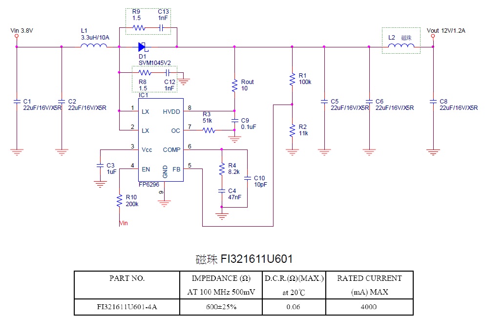 R8,C12 兩者靠近,且靠近LX 與GND Pin;R9,C13 兩者靠近,且靠近D1,輸出電容C5 的地一定要靠近IC 底部散熱片GND Pin,L2 使用磁珠(Bead)參考以下規(guī)格,測(cè)試條件鋰電池3.8V升壓12V/1.2A(水泥電阻10Ω),測(cè)試結(jié)果垂直與水平都通過(guò);L2 也可以選用電感1μH。