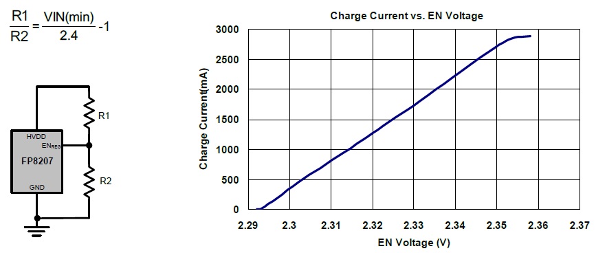FP8207 充電分成了涓流模式、定電流模式與定電壓模式,另外可利用EN PIN 來設(shè)定輸入電壓調(diào)節(jié)充電電流點(diǎn),避免輸入端(adaptor)功率輸出不夠而導(dǎo)致停止充電,相對(duì)應(yīng)關(guān)係如下圖所示:
