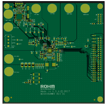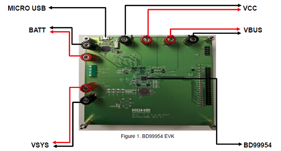 The BD99954MWV EVK acts as a platform for the BD99954 battery management LSI. With the included software GUI, users canaccess the battery charging profile and modify and read back the registers of the BD99954.