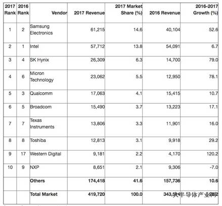 作為最大存儲(chǔ)芯片供應(yīng)商,三星在2017年半導(dǎo)體市場(chǎng)的份額達(dá)到14.6%,首次從英特爾手中奪走第一寶座。自1992年以來,英特爾一直是全球最大芯片制造商。