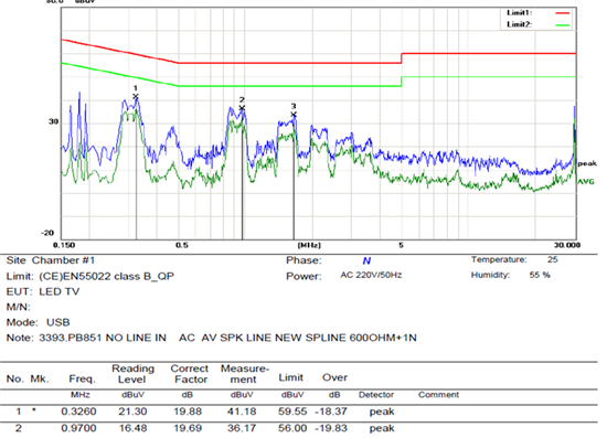 圖2展示了對(duì)揚(yáng)聲器線纜長(zhǎng)度接近1米的電視機(jī)的EMI測(cè)試結(jié)果。紅線是準(zhǔn)峰值限制,綠線是平均限制。