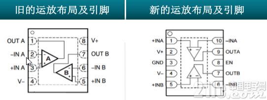 長(zhǎng)時(shí)間工作的電子器件都會(huì)面臨散熱的問(wèn)題,傳統(tǒng)音頻運(yùn)放布局通常左右兩邊是不對(duì)稱的,所以,工程師們通常為左右不同的散熱方式而大傷腦筋。如下圖所示,傳統(tǒng)的運(yùn)放布局的兩雙路運(yùn)放設(shè)計(jì)是一個(gè)運(yùn)放朝左,一個(gè)運(yùn)放朝右,而且芯片內(nèi)部不是對(duì)稱放置。這樣當(dāng)工作芯片發(fā)熱時(shí),它的熱不是對(duì)稱著熱的,在音頻界如果器件不對(duì)稱發(fā)熱會(huì)使器件產(chǎn)生失真。