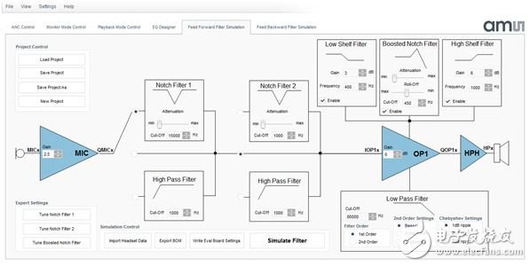 ANC濾波器設(shè)計(jì)工程師的目的是將圖4濾波器仿真線路中的增益和相位響應(yīng)與計(jì)算出的理想曲線匹配起來,F(xiàn)在人們使用的典型濾波器有一階低通濾波器、陷波濾波器、高架及低架濾波器。設(shè)計(jì)師必須了解不同的拓?fù)浣Y(jié)構(gòu)以及截止頻率、通帶、阻帶的計(jì)算方法。這當(dāng)然不是一個(gè)簡(jiǎn)單的任務(wù),尤其是當(dāng)他們不習(xí)慣使用spice仿真工具和模擬濾波器開發(fā)工具時(shí)。