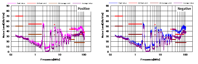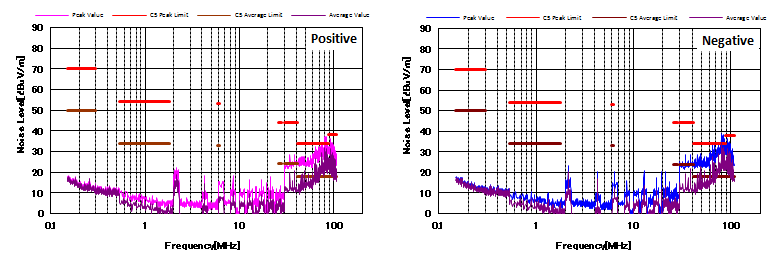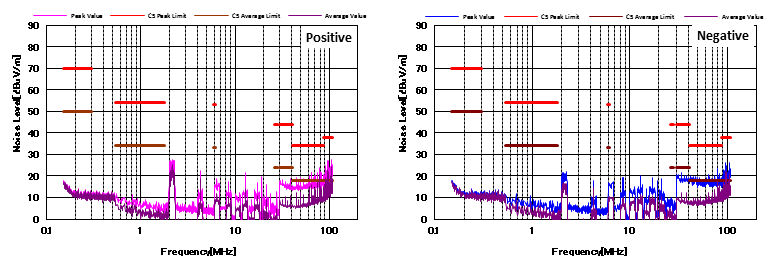 圖4顯示了增加CM和DM濾波器后的噪聲特性。 與圖3相比,CM濾波器的增加降低了近20dBμV/ m的CM噪聲。 并且EMI性能也通過了CISPR25 C5標(biāo)準(zhǔn)。
