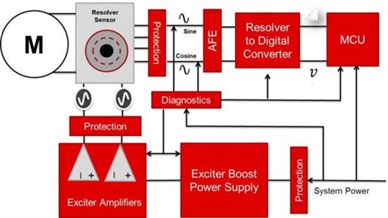 旋變的輸出是模擬信號,需要模擬前端(AFE)對信號進(jìn)行濾波、調(diào)整后,反饋給MCU進(jìn)行角度的計算。旋變數(shù)字轉(zhuǎn)換器(RDC)用來將正弦、余弦模擬信號轉(zhuǎn)換成數(shù)字信號。輸出端可以通過多種通信方式將位移、轉(zhuǎn)速信息傳遞給MCU,如SPI、并行接口、仿真編碼器接口、模擬接口等。最后,系統(tǒng)在傳感器和電子元件之間還需要多種保護(hù)和故障檢測功能,如過流保護(hù)、過壓保護(hù)、短路保護(hù)、過熱保護(hù)等。