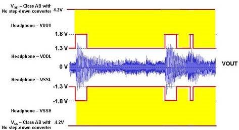 這種電源電壓為自適應(yīng)型。它在高音量音頻信號時升高,從而防止大峰值電壓失真,同時在小音頻峰值時下降來降低功耗。