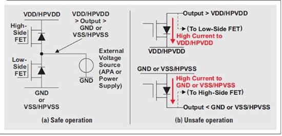 如果在關閉時另一個源連接至一個 APA 輸出,則它會強制 APA 輸出跟隨其電壓。如果 APA 為開啟狀態(tài),且另一個源可為強制 APA 進入 SCP 或 OCP 提供足夠的電流,則另一個源會強制 APA 輸出跟隨其電壓?梢杂袔追N不同的損壞方式。 正向偏置主體二極管