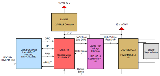 The focus of this designis to demonstrate the use of the DRV8711 steppermotor controller to control stepper motors at voltageshigher than 60 V. The DRV8711 operates at 12 Vwhile using additional circuitry to convert to highvolta