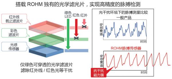 感光部由紅外截止濾光片和Green濾光片組成,采用僅綠色波長可穿透的ROHM獨有光學濾光片,成功將紅外線和紅外光等干擾的影響降低至一般產(chǎn)品的1/10以下。這使運動等劇烈變動和太陽光等紅外線較強環(huán)境下也可實現(xiàn)高精度的脈搏測量。