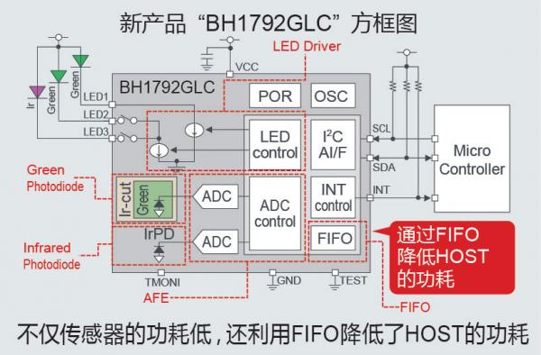 另外,與以往產(chǎn)品相比,新搭載了用來降低HOST(微控制器)端功耗的FIFO(First in First out)功能,通過降低脈搏傳感器和微控制器的功耗,助力應用實現(xiàn)長時間驅動。
