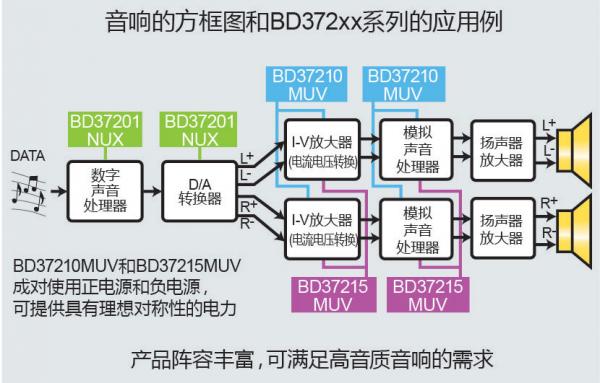 產(chǎn)品陣容包括:非常適用于在低電壓下工作的數(shù)字器件(DA轉(zhuǎn)換器、DSP等)的BD37201NUX、非常適用于在高電壓或正負兩個電源下工作的模擬器件(聲音處理器、電流-電壓轉(zhuǎn)換放大器等)的BD37210MUV(正電源)和BD37215MUV(負電源)。未來還會在這些產(chǎn)品的基礎上繼續(xù)擴充產(chǎn)品陣容,強有力地支持音響設備的高音質(zhì)化發(fā)展。