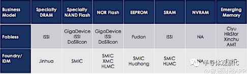 中國公司兆易創(chuàng)新歷來是NORflash的供應商。最近,該公司并購了ISSI,現在也供應專業(yè)的DRAM和NAND。但考慮到這整個市場基本被三星、海力士以及美光三大廠商壟斷,未來一段時間內,兆易創(chuàng)新想要進入DRAM和NANDFlash全球市場第一梯隊十分困難。該公司又從東芝購買了SLCNAND(SLC為NAND閃存架構),并與博通、漫威、高通和英特爾公司之間有合作。圖2名單包含了有/沒有晶圓廠的中國公司。
