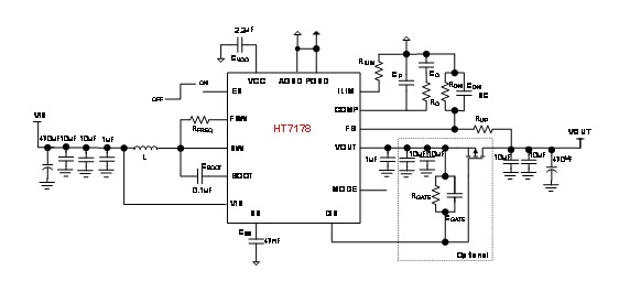 ①.HT7178的輸入電壓范圍是2.7V到15V, 輸出電壓范圍是4.5V到20V。該芯片集成了兩個低導(dǎo)通電阻的功率MOSFET:一個11mΩ開關(guān)FET和一個13mΩ整流器FET,使用具有集成斜坡補償功能的固定頻率峰值電流模式控制。HT7178 PFM,PWM兩種模式可選,匹配不同的應(yīng)用場合,提高效率。