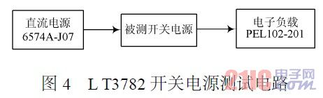 為了驗證該開關電源性能,采用如圖4所示的方法進行驗證。因為該電源的輸入電流較大,輸入的直流電源采用安捷倫的6574A2J07。它的輸出電流最高可達42A,輸出電壓在0~50V范圍內可調,輸出負載采用建伍的PEL1022201,通過它可以直觀地看到輸出電壓和電流情況。經(jīng)過驗證,該電路完全滿足使用單位需求。