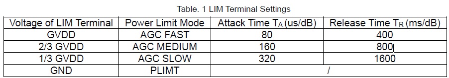通過(guò)設(shè)置LIM引腳從GVDD的分壓值,HT317可進(jìn)入不同的自動(dòng)增益控制模式或限幅功能,如下表所示。