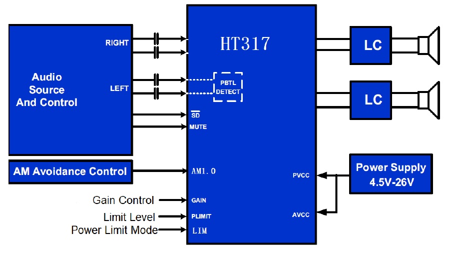HT317具有豐富的功率限制能,以滿足各類應(yīng)用。一種是限幅功能(PLIMT),即在輸出端限制在輸出端限制其最大輸出擺幅低于設(shè)定值 ,可避免意外的超額輸出功率損壞喇叭 。另一種為 自動(dòng)增益控制功能(AGC),開(kāi)啟后,可有效改善因輸入幅度過(guò)大或者電源壓降低造成的破音失真。