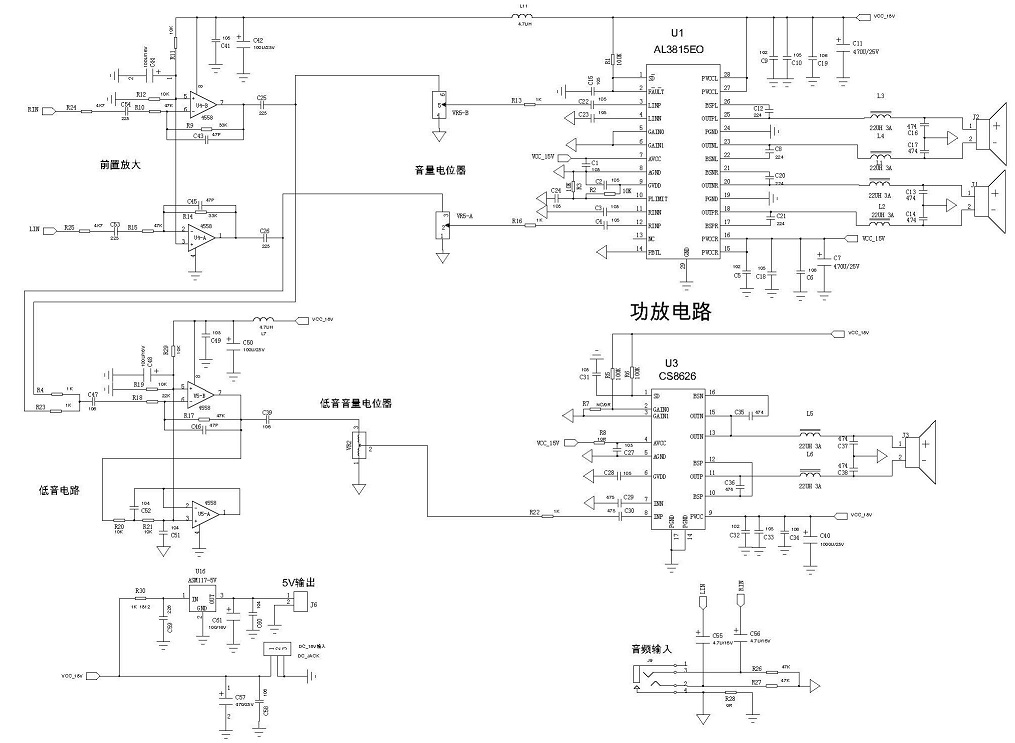 AL3815驅(qū)動立體聲,可提供2X15W/8Ω持續(xù)功率輸出;