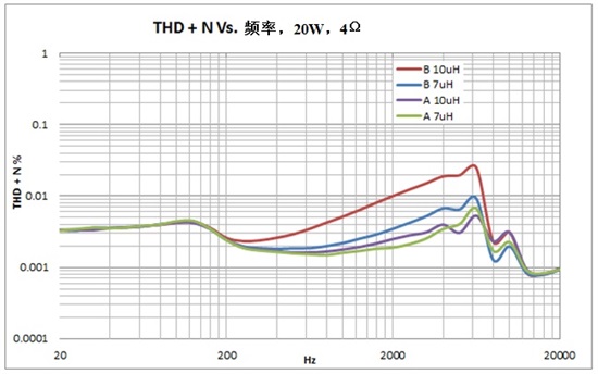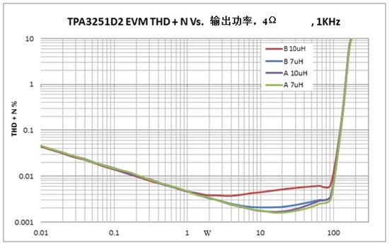 從TPA3251D2EVM收集的數(shù)據(jù)來看,生產(chǎn)商A的10μH電感器優(yōu)于制造商B的10μH和7μH電感器。若我選擇制造商B的10μH電感器,放大器的THD性能將在10W條件下限制在0.0045%,相比之下,制造商A的10μH電感器將限制在0.0017%。