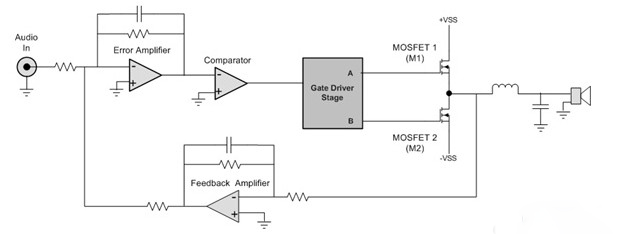 PWM信號進行適當?shù)碾娖阶儞Q,然后送到柵極驅動器,這個驅動器控制由MOSFET(M1和M2)組成的雙態(tài)功率電路。放大后的信號然后通過輸出濾波器(消除PWM載波頻率),最終僅僅放大了的模擬音頻信號驅動揚聲器。通過把濾波器輸入信號反饋到錯誤放大器輸入端,進行外部環(huán)路濾波,降低了失真和噪聲,進一步提高了音頻輸出保真度。