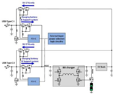 圖1顯示了一種新的USB-C架構(gòu),該架構(gòu)由ISL95338雙向降壓-升壓穩(wěn)壓器和ISL95521A組合式電池充電器或ISL9238降壓-升壓電池充電器組成。這種新架構(gòu)允許系統(tǒng)通過USB-C端口給電池充電,當(dāng)兩個PD充電器插入USB-C_1和USB-C_2時,還支持快速充電功能。無需額外復(fù)雜的端口控制邏輯電路或IC,該架構(gòu)的兩個端口就可全面支持USB 3.1 On-The-Go(OTG)。