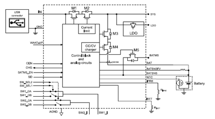 The STBC03 is a highly integrated power management, embedding a linear batterycharger, a 150 mA LDO, 2 SPDT load switches, and a protection circuit module(PCM) to prevent the battery from being damaged under fault conditions.