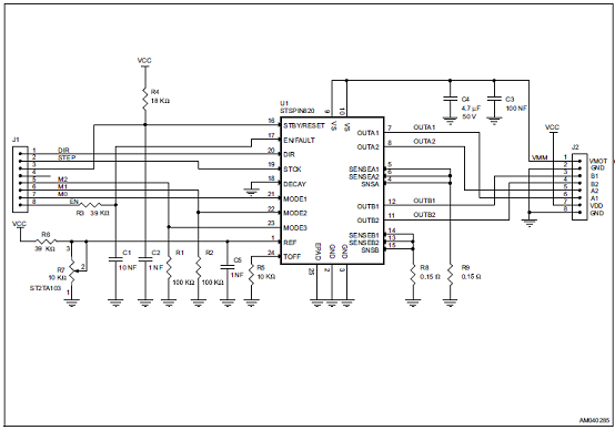 The microstepping resolution can be easily set toone of eight available values through M1, M2 andM3 inputs: full-step, 1/2, 1/4, 1/8, 1/16, 1/32,1/128 and 1/256 of step.It is simply controlled through step and directionports and embeds the PWM current controlalgorithm with selectable decay mode (fast + slowor slow) and the adjustable reference voltagelevel through an embedded potentiometer.