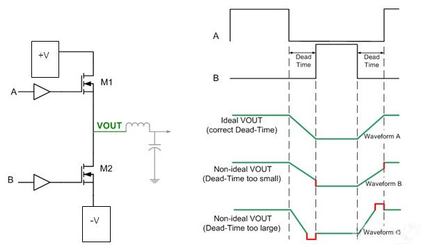 D類放大器死區(qū)時(shí)間(即兩個(gè)開關(guān)均處于關(guān)閉狀態(tài)時(shí)的時(shí)間段)直接影響到效率和THD。過于短暫的死區(qū)時(shí)間會引起直通電流,降低效率,過長的死區(qū)時(shí)間又會增大THD,這會給音頻保真度帶來不利影響。