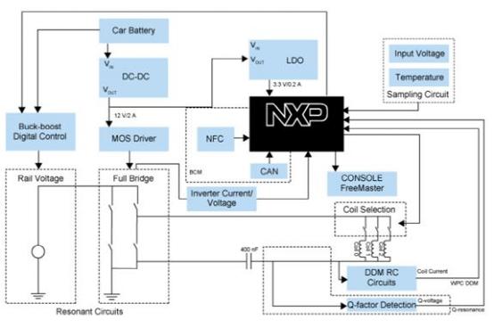 圖示1-應(yīng)用于汽車平臺的基于NXP產(chǎn)品的無線充電解決方案的系統(tǒng)方案圖