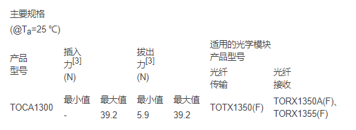 該款新產(chǎn)品為單向光模塊適配器,用于連接光纖傳輸模塊和光纖接收模塊進行短距離數(shù)據(jù)傳輸。在需要比采用光電耦合器時的絕緣距離更長,以及比光纖電纜的傳輸距離更短的場合,TOCA1300可代替光纖。 該適配器與東芝光纖耦合器[2]相結(jié)合可實現(xiàn)光傳輸。